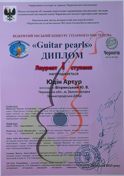 Вітаємо нашого учня-гітариста Юдіна Артура з успішним дебютом на його першому конкурсі. Бажаємо старанності, наполегливості, терпіння і радості від праці на улюбленому інструменті та нових творчих успіхів!